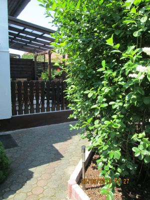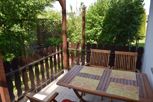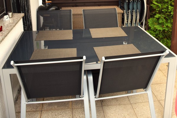 4 Gartenstühle aus Holz, Tisch (bei 5er Belegung wird 5.Stuhl bereitgestellt)